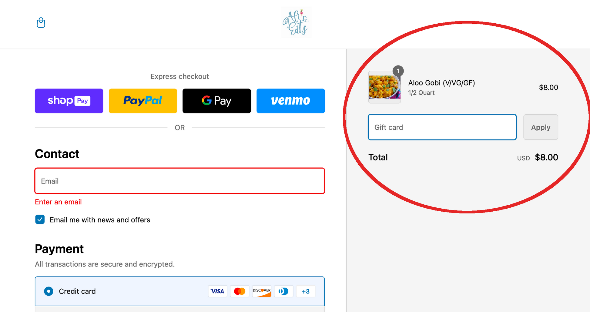 If you prefer physical gift cards, you can purchase those directly from Ali at the kitchen, but not online.
